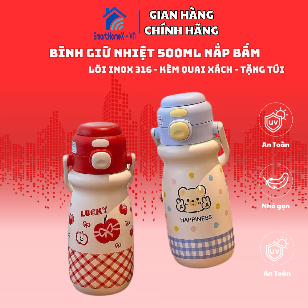 🔥 [Tặng Túi] Bình Giữ Nhiệt 500ml Lõi Inox 316 Nắp Bấm, Hai Kiểu Uống – Hoạt Hình Ngộ Nghĩnh, Kèm Quai Xách đang giảm giá!