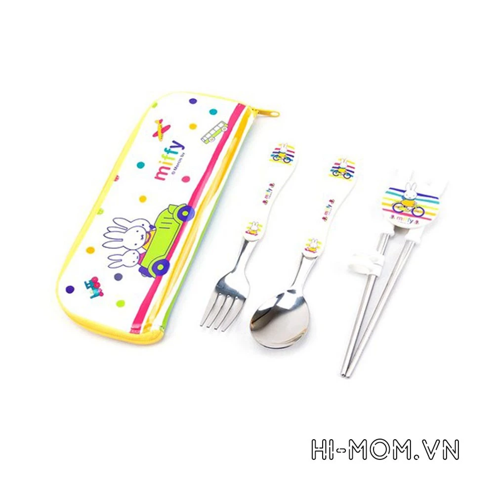 Để hỗ trợ trẻ học dùng đũa hiệu quả, bộ dụng cụ ăn uống hình thỏ Miffy từ Hàn Quốc là một lựa chọn tuyệt vời. Bộ dụng cụ này bao gồm: